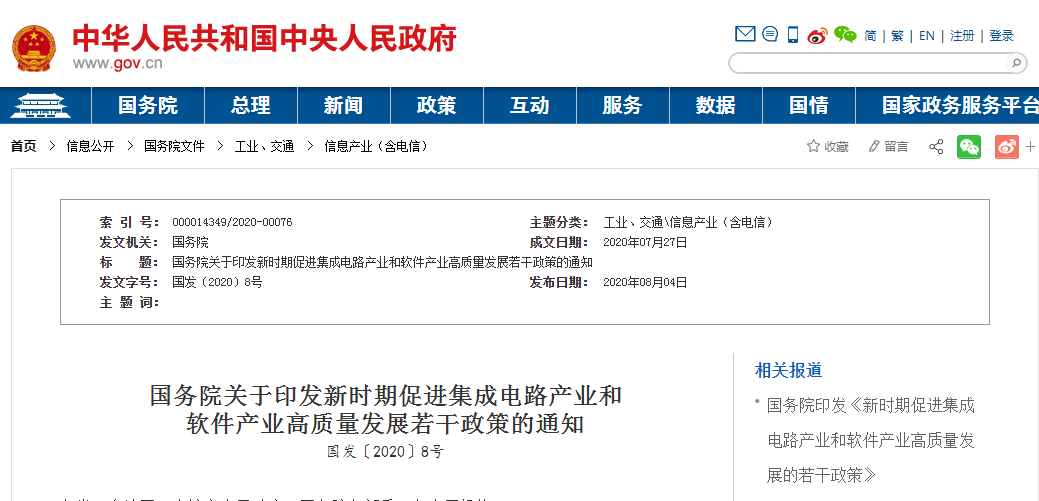 8月4日,国务院印发《新时期促进集成电路产业和软件产业高质量发展的若干政策》(国发〔2020〕8 号,以下简称“新政”),该新政共计5000余字,分别从财税、投融资、研究开发、进出口、人才、知识产权、市场应用、国际合作八个政策方面出发,规定40条支持集成电路和软件产业的细则,自印发之日起实施。