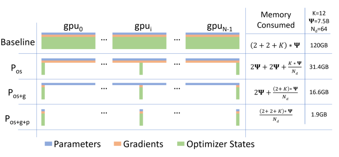内存消耗,以及三个阶段的ZeRO-DP优化。Ψ表示模型大小(参数数量),K表示优化器状态的内存乘数,N_d表示DP度。在本例中,我们假设模型尺寸ψ=7.5B,DP为N_d=64,K=12,基于Adam优化器的混合精度训练。