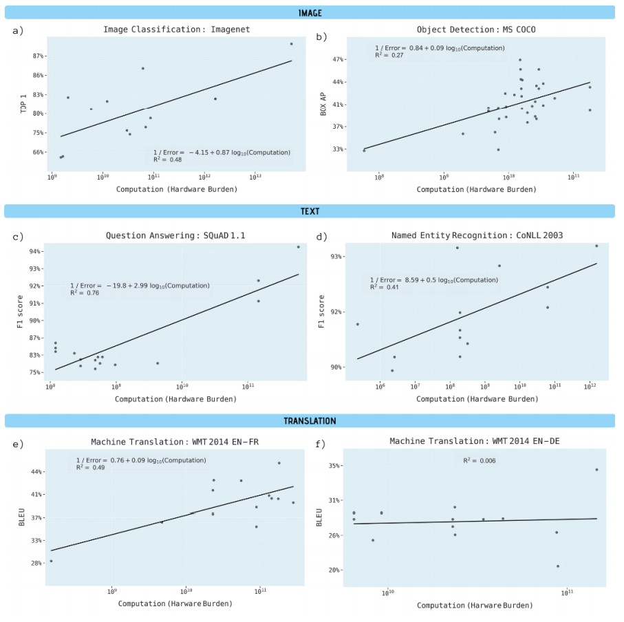 性能会平稳提高。为了获得最佳性能,必须同时放大所有三个因素。当没有其他两个瓶颈时,经验性能与每个因素都有幂律关系。
