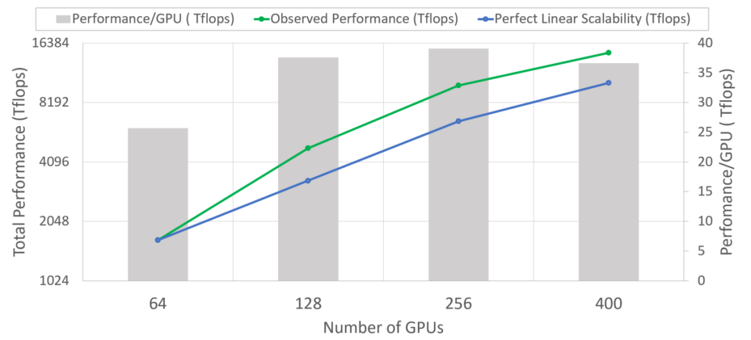 从16路模型并行开始,可以运行15.4倍的大型模型,而不会真正造成性能损失,而在运行16路模型并行和64路数据并行(1024个