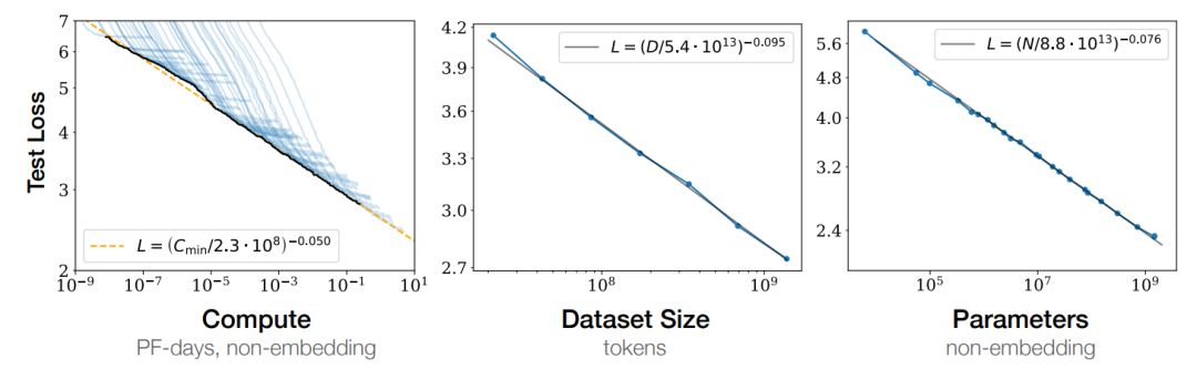 自家论文《Scaling Laws for Neural Language Models》的方法,我们能得出一个经验规律,即语言模型的性能与参数量、数据集规模和训练吞吐量存在简单的幂律关系。