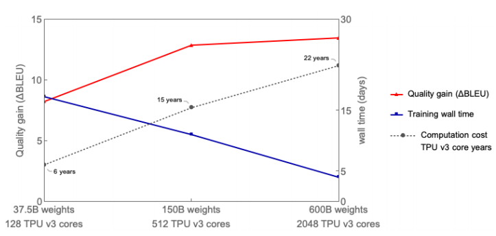 的一项新研究,谷歌提出了Gshard模型,这个模型有6000亿参数,论文中的一张图能明显看出BLUE分数的提升与参数量增加的关系。