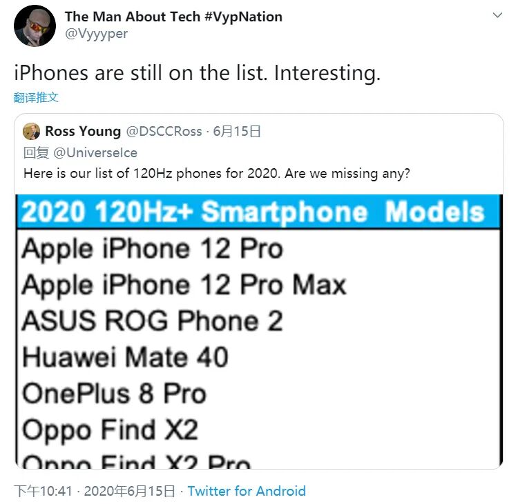 但这件事有靠谱的来源还得追溯到今年年中的时候,6月15日,显示器供应链顾问公司DSCC的创始人兼首席执行官Ross young在推特上爆料称,iPhone 12 Pro/Pro Max屏幕将支持120Hz+高刷新率。