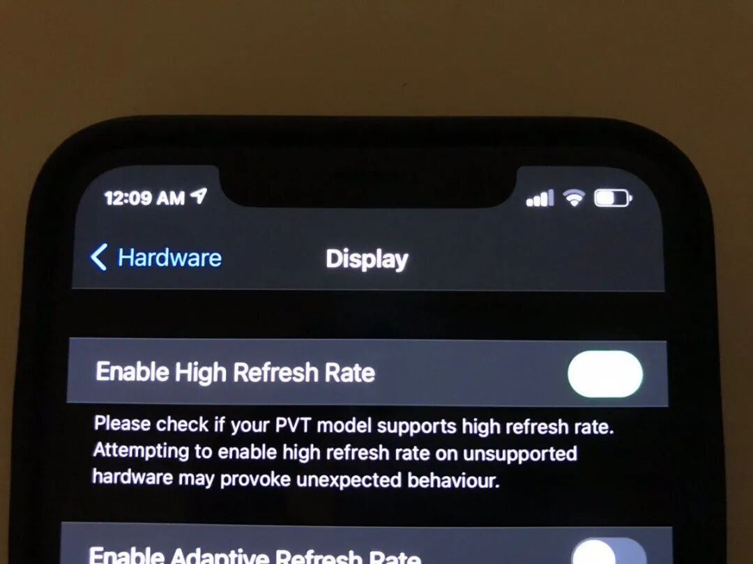 可以看到其中有两个选项:启用高刷新率和启用自适应刷新率。前者是开启iPhone 12 Pro Max的120Hz刷新率,后者则是根据屏幕上显示的内容自动在120Hz和60Hz之间进行调整。