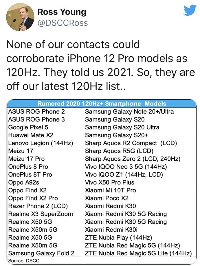 8月4日,Ross Young 称,他们得到的消息是,苹果 iPhone 12 并没有支持 120Hz 屏幕的硬件,没有 120Hz 驱动 IC。