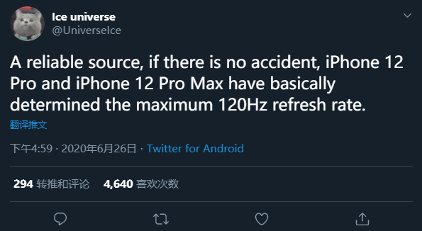 国内爆料人冰宇宙也在6月26日爆料称,根据可靠的信息来源,如果不出意外,iPhone 12 Pro和iPhone 12 Pro Max基本确定了将会搭载一块具备120Hz刷新率的屏幕。
