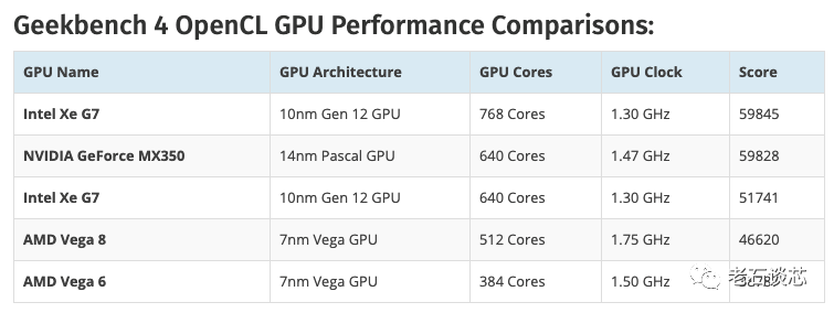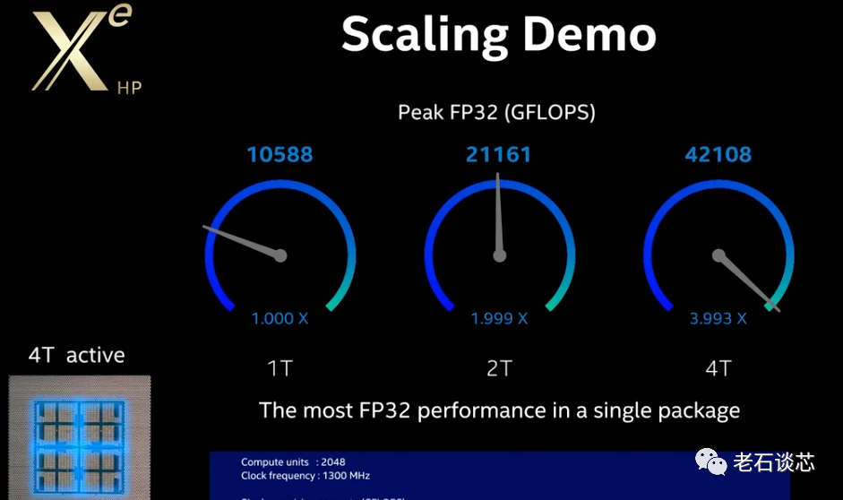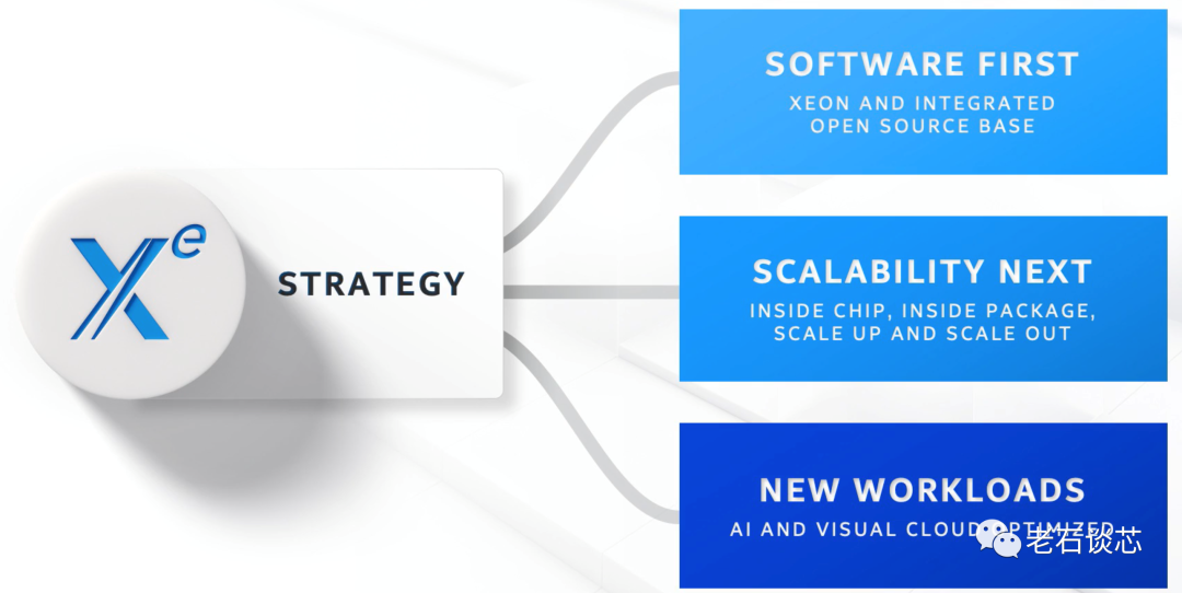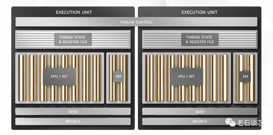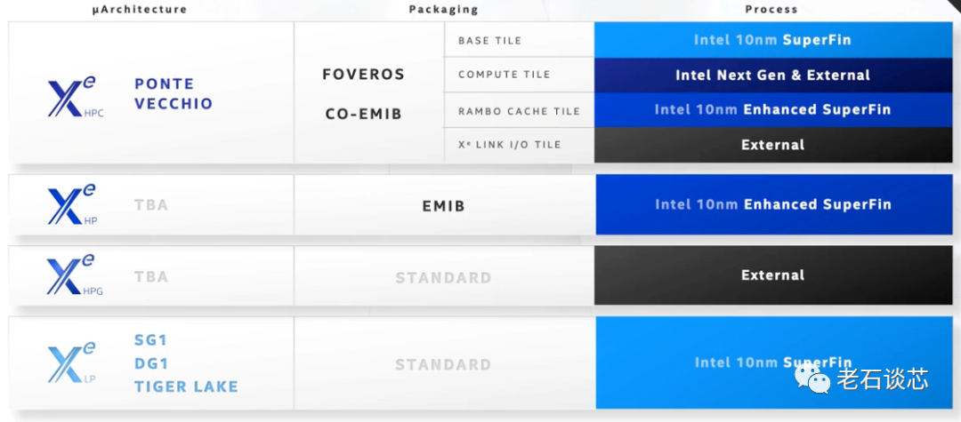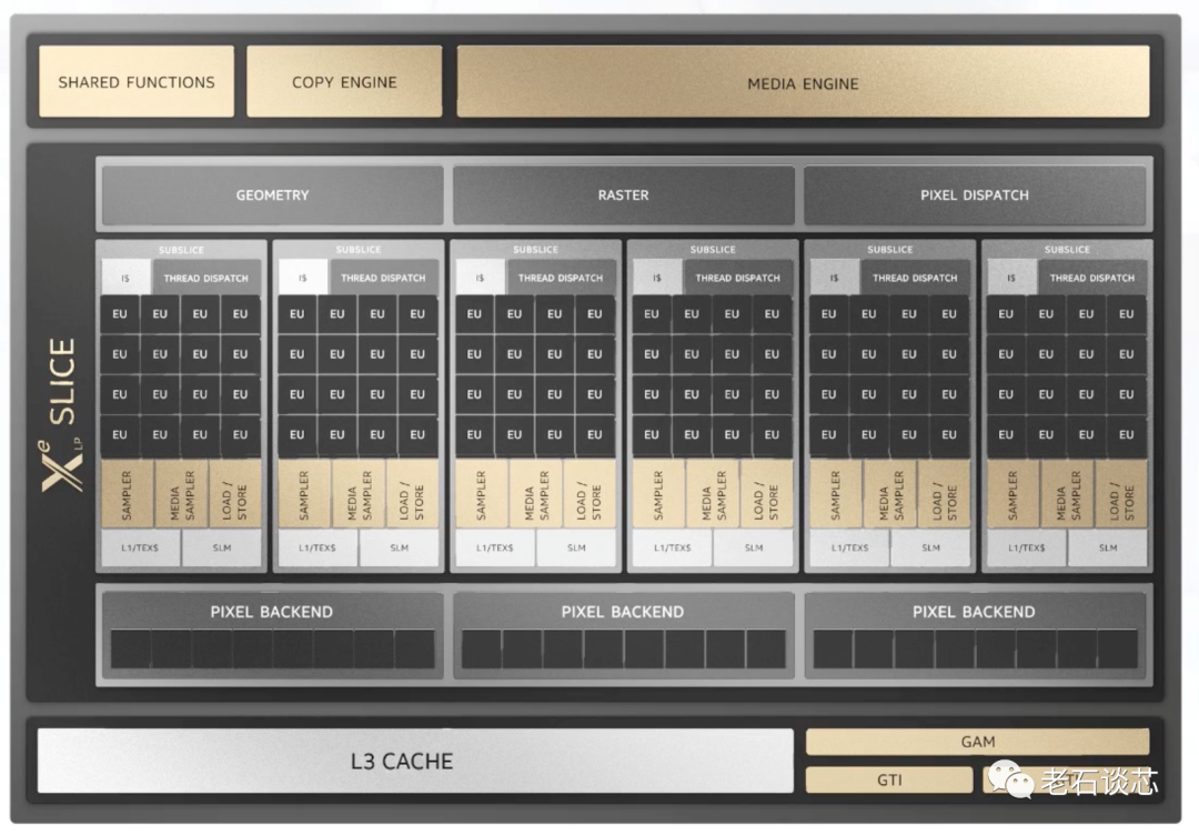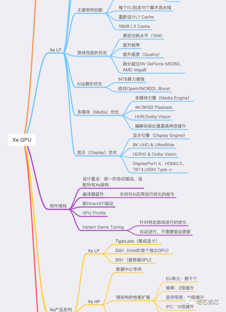 Xe GPU是英特尔近年来重点研发的下一代GPU架构。和英特尔之前的集成GPU不同,Xe更多的是一个基础GPU架构,由此可以衍生出多种针对不同应用领域和场景的GPU产品。这次正式发布的Xe GPU产品系列,从主打集成显卡和入门级独立显卡的XeLP,到针对游戏和桌面性能进行优化的Xe HPG,再到主要应用于数据中心和AI的Xe HP,然后还有面向高性能计算的Xe HPC,一共四大系列。特别值得注意的是,这四类Xe GPU将使用不同的半导体制作工艺进行流片生产,其中不仅包含英特尔自家的10纳米工艺,以及这次发布的下一代10纳米SuperFin工艺,还包含了来自其他代工厂的工艺。虽然在发布会上没有直接点名,但台积电以6纳米工艺拿下英特尔数十万片芯片订单的消息,早就是公开的“秘密”了。在今年的HotChips大会上,英特尔对Xe架构进行了深入介绍。可以看到,Xe GPU毫无疑问被英特尔寄予厚望。Xe的出现,正式宣布英特尔进军高性能GPU领域,也完成了英特尔的Scalar(CPU)、Vector(GPU)、Matrix(ASIC)、Spatial(FPGA)四大计算类型的芯片全覆盖。在这篇文章中,我将从硬件架构、软件堆栈、应用场景等领域对Xe GPU进行深入的技术解析。我用思维导图的形式,总结了本文涉及的全部技术要点。完整版的思维导图,可以在公众号里回复“xe”获取。思维导图以及英特尔Xe在HotChips2020的演讲幻灯片,均已上传至知识星球“老石谈芯 – 进阶版”,请在文末扫码进入星球查看。Xe的主要设计思路有三点:软件先行、兼顾扩展、全新应用。这表明Xe并非是作为一个孤立的产品出现,而是会结合英特尔完整的硬件产品组合、以及统一的软件开发环境而协同设计。Raja多次强调,希望使用相同的软件栈、相同的微架构设计,实现多个Xe产品的快速扩展,这在后面的文章中也会多次提及。Xe的主体架构基于Slice实现,最多有6个subSlice,共计高达96个EU(Execution Unit),能提供每周期1536次浮点运算。和英特尔的前一代集显相比,XeLP几乎重新设计了自身的微架构,特别是最基本的运算执行单元EU。XeLP的EU架构示意图如下所示。在英特尔的第11代集显中,每个EU里包含8个用来进行算术运算的流水线。为了得到更高的算术运算性能,XeLP将EU里的算术运算流水线扩展了一倍,达到16条。这些算术运算流水线可以执行定点数、单精度浮点数和双精度浮点数运算,以及复杂数学运算和可选的矩阵运算的扩展。每条流水线的宽度都比上一代得到了增加,从而将INT16和INT32的性能提升了一倍。事实上,为了简化实现过程,XeLP将上一代集显的两个EU单元合并在一起,并共用一个线程管理模块。在存储系统方面,XeLP重新设计了L1 Cache,并将L3 Cache的容量提升到了16MB。此外还将显卡内存的带宽增加了一倍。XeLP主要的市场定位是集成显卡以及入门级独立显卡。即便如此,XeLP也对游戏性能进行了针对性的优化。下面就是一些在XeLP上运行的游戏截图,例如,XeLP可以支持战地5在1080p、30FPS和特效全开时的流畅运行。 在具体的优化方面,首先就是在保持相同性能的前提下,大幅降低了功耗。例如,下图展示了在运行战地1的时候,英特尔前一代GPU和XeLP的画面和功耗对比。可以看到,在画质相似的情况下,前一代GPU的功耗为25瓦,而XeLP仅为15瓦。此外,XeLP还对帧率进行了提升,这也能很大程度上避免掉帧,使得画质表现更为细腻,在下图中坦克的履带部分也能较为明显的看出来。正因如此,在相同功耗条件下,XeLP可以在保证稳定帧数的同时,带来更高质量的画面效果。下图就对比了前一代GPU和XeLP的画面渲染能力和画质。可以看到,XeLP的细节表现能力要远超于前一代GPU,比如对阴影部分和车体细节的刻画等等。在跑分方面,和同级别的英伟达GeForce MX350、以及AMD的Vega8相比,XeLP GPU跑出了更高的评分,见下表:值得注意的是,这里参与跑分的是集成在Tiger Lake里的集成Xe GPU,但它的跑分竟稍微超过了英伟达的独立显卡MX350。要知道,后者不仅有更高的频率,还有2GB的GDDR5显存。这也从另外一个角度印证了Xe的性能潜力。在英特尔最新的Tiger Lake架构中,包含了名为Willow Core的全新CPU内核单元,以及XeLP的集显版本。关于Tiger Lake和Willow Core的详细技术解读,将会在下篇文章里进行深入介绍。这里想提到的是,Tiger Lake里的XeLP还对AI运算进行了一定的架构优化。当结合OpenVINO工具包和英特尔的DL Boost技术时,就可以大幅提升AI推断的算力。如下图所示,当运行Gigapixel AI进行图像增强时,XeLP和前两代GPU相比取得了指数级的算力提升。XeLP对于多媒体和显示方面的优化,主要的受众就是广大的视频和图像内容创作者。这方面的优化主要有三个主要方向,即提供更多的像素、更多色彩、以及更低的功耗。具体来说,XeLP里集成了多媒体引擎(Media Engine),它支持4K/8K60帧视频、Dolby视界HDR等一系列超高清视频标准,在编解码吞吐量上达到了最高2倍的性能提升。在XeLP的显示引擎(Display Engine)里,集成了4条像素处理流水线,使得XeLP支持包括DisplayPort1.4、HDMI2.0、USB4 Type-C等多种视频接口,以及8K UHD、HDR10和杜比视界等多种超高清视频的播放。关于多媒体引擎和显示引擎的具体架构细节,可以参见Xe在HotChips2020上的幻灯片,已上传至知识星球。Xe作为一个全新的GPU产品系列,它的一个主要优化重点就在于软件系统的设计。它的设计重心,就是为现在和未来的Xe架构使用统一的驱动协议栈,这与英特尔oneAPI的核心思想是一致的。oneAPI是英特尔