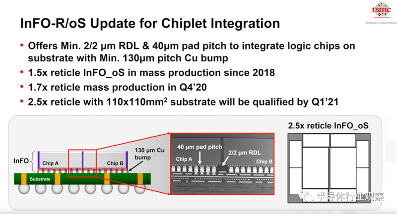 为了满足芯片间更高密度的RDL需求,台积电还提供了InFo-L制程,通过在InlFo-R中加入了loca silicon interconnect(LSI)来达到上述目的。InFo-L技术不但提供了更高密度来节省芯片面积,也提供了最小的线宽和线距。这个技术将在明年初完成相关验证。