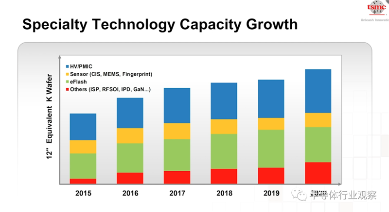 从刘信生的介绍我们得知,自2009年以来,台积电在这方面技术取得了杰出的成绩,其等效八英寸晶圆的年平均复合增长率也高达17%。据介绍,在2019年,台积电在这方面取得了1270万片等效八英寸晶圆的出货量。
