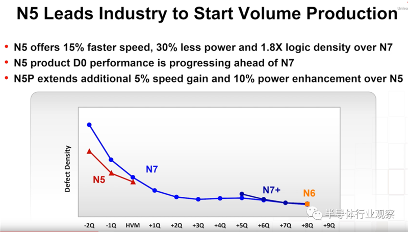 2020年,台积电开发工艺的另一个里程碑是5nm的量产,与7nm相比,新工艺的速度提升了15%,功耗降低了30%,而逻辑密度则是前者的1.8倍。在良率方面,新工艺的进展也非常顺利。其D0已经超越了同时期的7nm。