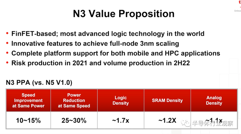 “基于这两点考量,我们在3nm工艺上,将继续使用FinFET,而这一点工艺将在性能、功耗和密度上也会有明显的提升”,张晓强说。如下图所说,与5nm相比,台积电的3nm的速度将提升10%到15%,功耗将提升25%到30%,逻辑密度将是前者的1.7倍,SRAM密度也将能提升20%,就连模拟密度也提升了10%。根据台积电规划,3nm工艺将在2022年下半年进行量产。