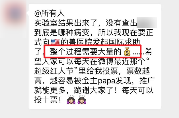 比如,有的博主就会在粉丝群中,利用粉丝们对宠物的关心,为自己拉票,并诱导粉丝为推广广告买单: