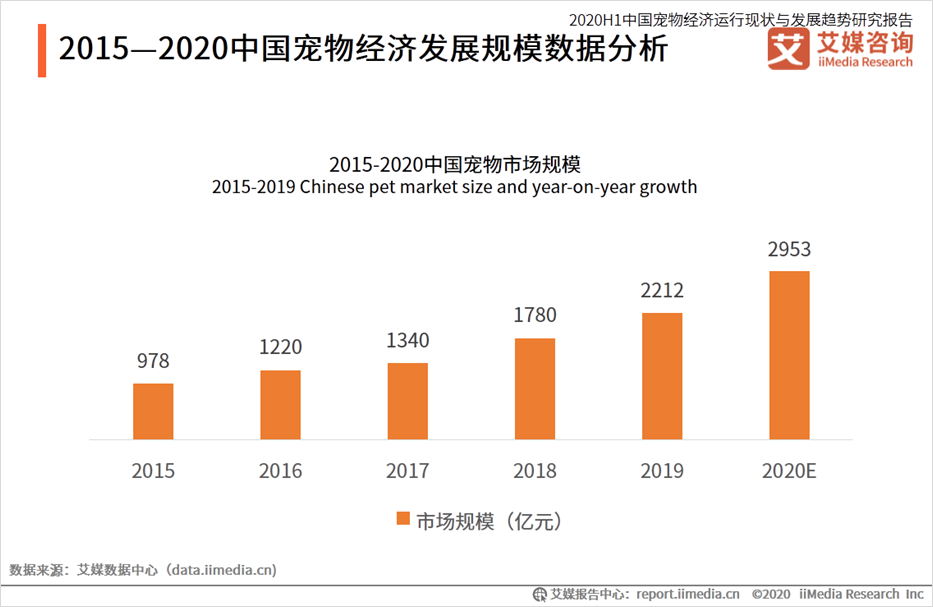 据 @艾媒咨询 数据显示,2020 年宠物市场规模已经达到了 2953 亿元,而且还有不断扩大的趋势: