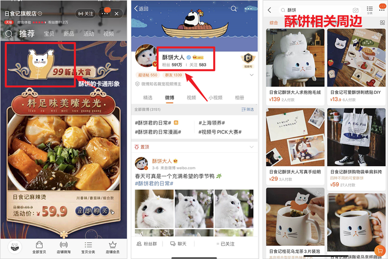 比如,经常在日食记视频中出现的那只小白猫酥饼,现在已经在微博坐拥 500 多万粉丝,不仅有自己的周边售卖,还是日食记的“品牌形象代言人”: