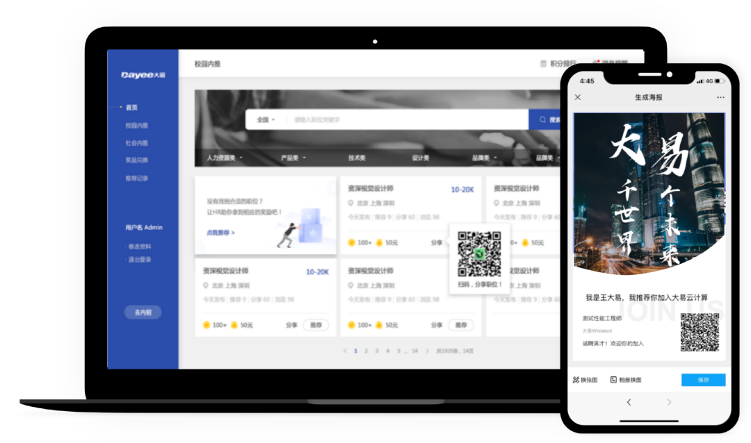 大易全新推出「人人都是招聘官」解决方案,将面试官角色权限变被动为主动,并通过人才获取、流程参与、保温追踪、数据洞察等四大功能,助力企业充分调动业务部门的参与感,将「人人都是招聘官」的概念变为现实。内推已成为了企业成本最低、转化率最高的招聘渠道。大易提供满足多样化场景的内推平台,支持员工随时随地免登录直达;员工可以将岗位一键转发给朋友或分享到社交网络,并且根据候选人应聘进展,获得相应的积分奖励。当招聘不再是HR单枪匹马的冲锋,而是和用人部门的并肩作战,如何才能让双方更好地协作配合,尽量减少沟通和协调的成本,提供工作效率?大易全新上线移动端面试官工作台,从筛选到面试,从评价到offer,实现全流程的主动招聘。用人经理不仅可以主动搜索简历,慧眼识人,捕捉有潜在可能的漏网之鱼,还能通过移动端的工作台随时随地推荐简历、填写评价,让双方的沟通更加敏捷。