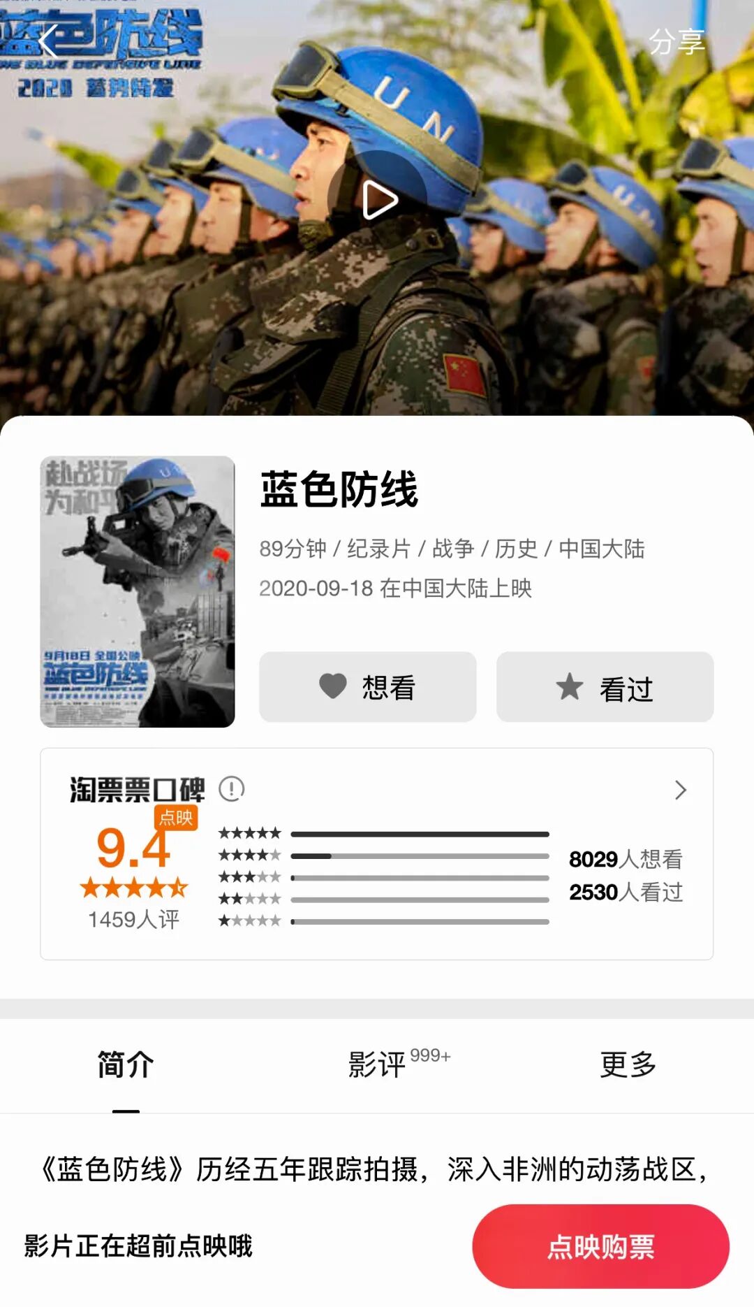 今天,电影《蓝色防线》开分了,在淘票票上获得了高达9.4分的高分,是今年开分最高的电影。它记录了中国维和部队在南苏丹执行维和任务、保护当地难民营安全的故事,是我国首部海外维和战地纪实电影。
