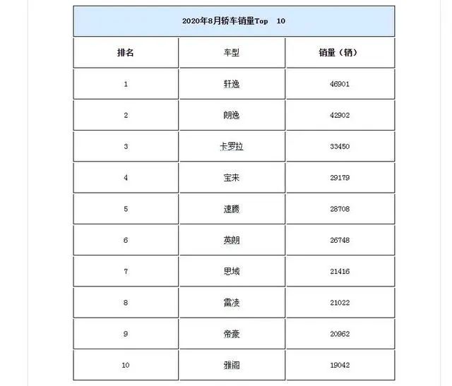 综述:8月轿车销量排行榜出炉,冠军轩逸依旧是冠军,国产车(逸动和帝豪)进步了一点点!