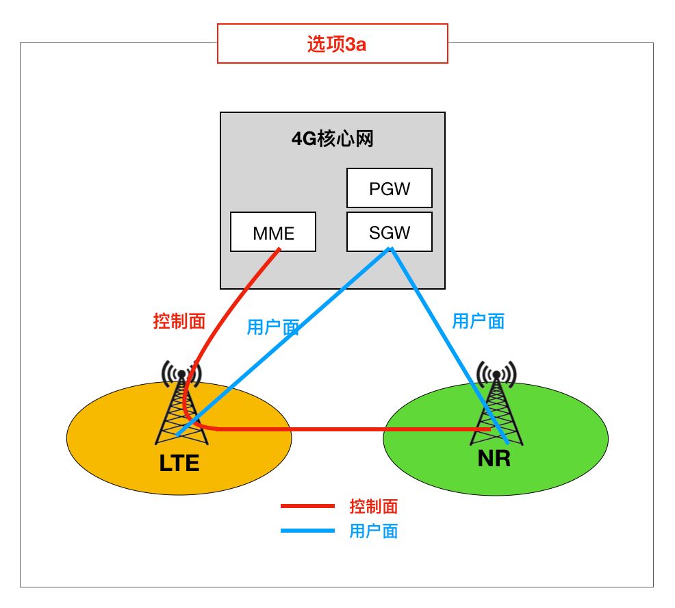 选项3a和选项3的差别在于,不再让4G基站鸭梨山大,4G和5G数据流量不再通过4G基站分流和聚合,而是用户面各自直通4G核心网,仅控制面锚定于4G基站。