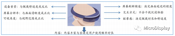 随着VR/AR市场关注度提升,微软、SONY、三星、HTC等公司相继推出了有影响力的硬件产品。影响VR/AR设备使用体验的因素如下图所示: