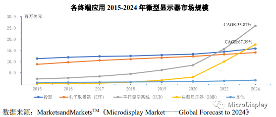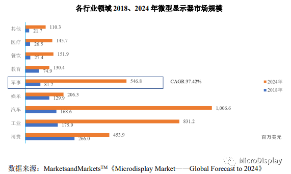 微型显示器可以广泛应用消费、工业、汽车、运动娱乐、军事、教育、餐饮零售、医疗等行业。根据MarketsandMarketsTM的研究报告,2018-2024年,军事用途将成为微型显示器市场规模增长最为迅速的领域,年均复合增长率达到37.42%,预计2024年将实现546.8百万美元的市场规模。
