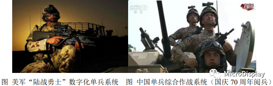 全球军队实现数字化装备是未来发展趋势,数字化装备士兵是信息化部队的基本单元,数字化士兵基本的信息装备包括头盔、微型电脑、通信装备等,而头盔微型显示装置是重要的显示终端。美军的“陆战勇士”数字化单兵系统使用eMagin的OLED微型显示器配套综合头盔子系统的头戴显示器(HMD),通过该显示系统,士兵能观看计算机发出的图解数据、数字化地图、情报资料以及安装在武器上热成像武器瞄准器和摄像机的成像。目前各国都在研发或列装数字化单兵系统,如俄罗斯“战士”数字化单兵系统、法国FELIN单兵作战系统、中国QTS11式单兵综合作战系统等。