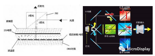 LCoS(LiquidCrystalonSilicon)是LCD与CMOS集成电路有机结合的反射型新型显示技术,其结构是在硅片上,利用半导体制程制作驱动面板,然后在电晶体上透过研磨技术磨平,并镀上铝当作反射镜,形成CMOS基板,然后将CMOS基板与含有透明电极之上玻璃基板贴合,再注入液晶,进行封装测试。