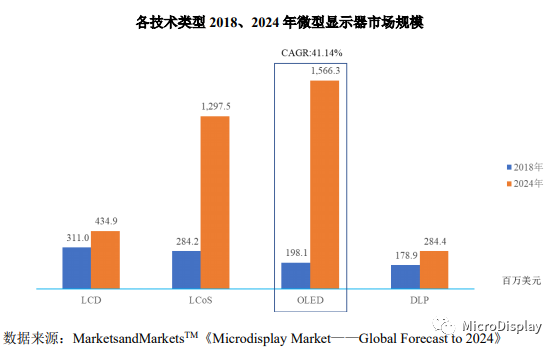 根据市场研究机构Marketsand MarketsTM的研究报告,OLED微型显示器市场规模增长最为迅速,年均复合增长率达到41.14%,预计2024年将实现1,566.3百万美元的市场规模,并最终超过LCD与LCoS成为微型显示器应用最为广泛的技术类型。