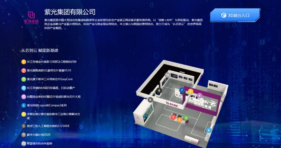 同时,紫光集团作为30家企业之一,也被邀请入驻了线上智博会的精品馆,在现场的嘉宾可以驻足观看更为紧凑的展示线和更为优化的紫光集团展品内容,感知紫光集团“从芯到云”的全面能力。