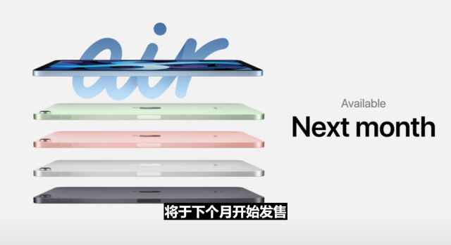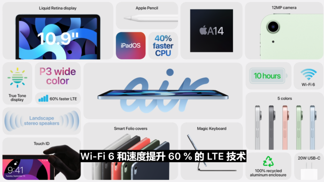 另一个亮点在于,新一代iPad Air采用了全新的外观设计,首次用上了10.9英寸的全面屏。与此同时,它原有的Touch ID功能首次被整合到顶部的电源键上。除玫瑰金、深空灰、绿色等配色外,它还首次支持了天蓝色的全新配色。