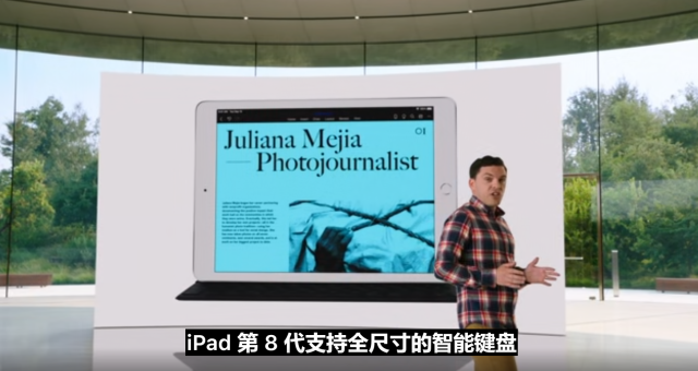 除此之外,第8代iPad后置800万像素摄像头及一枚传感器,前置FaceTime高清摄像头,支持增强现实(AR)体验;总体轻薄,重量约为1斤,电池续航最长可达10小时,充满1次电基本可以满足一天所需。第8代iPad售价为2499元起,将于9 月17日接受订购,20日正式发售。
