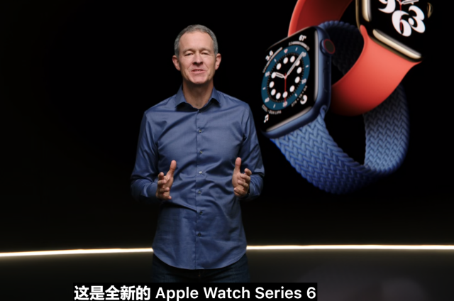 发布会上首先亮相的是 Apple Watch Series 6。据介绍,它搭载了S6芯片,基于A13芯片打造,性能比上一代提升20%。在延续往代ID设计风格的基础上,苹果本次推出了手表的新配色:红色、蓝色、墨色和金色,还提供了新的表壳和表带。