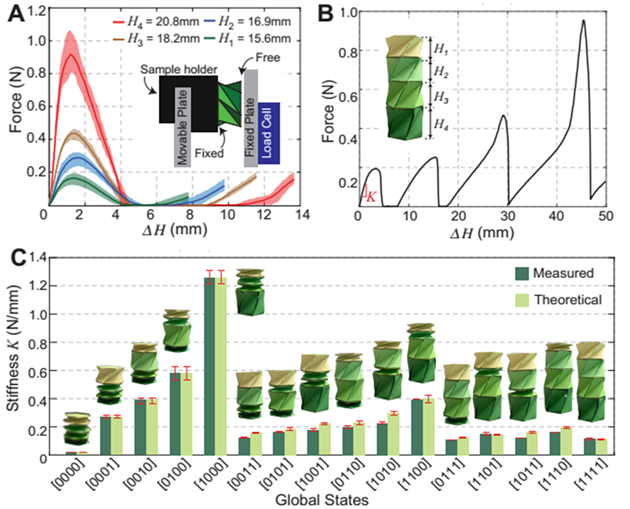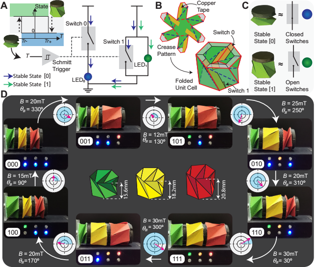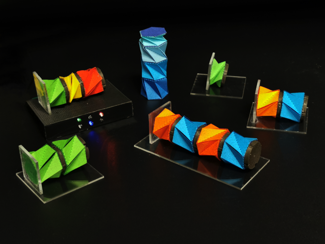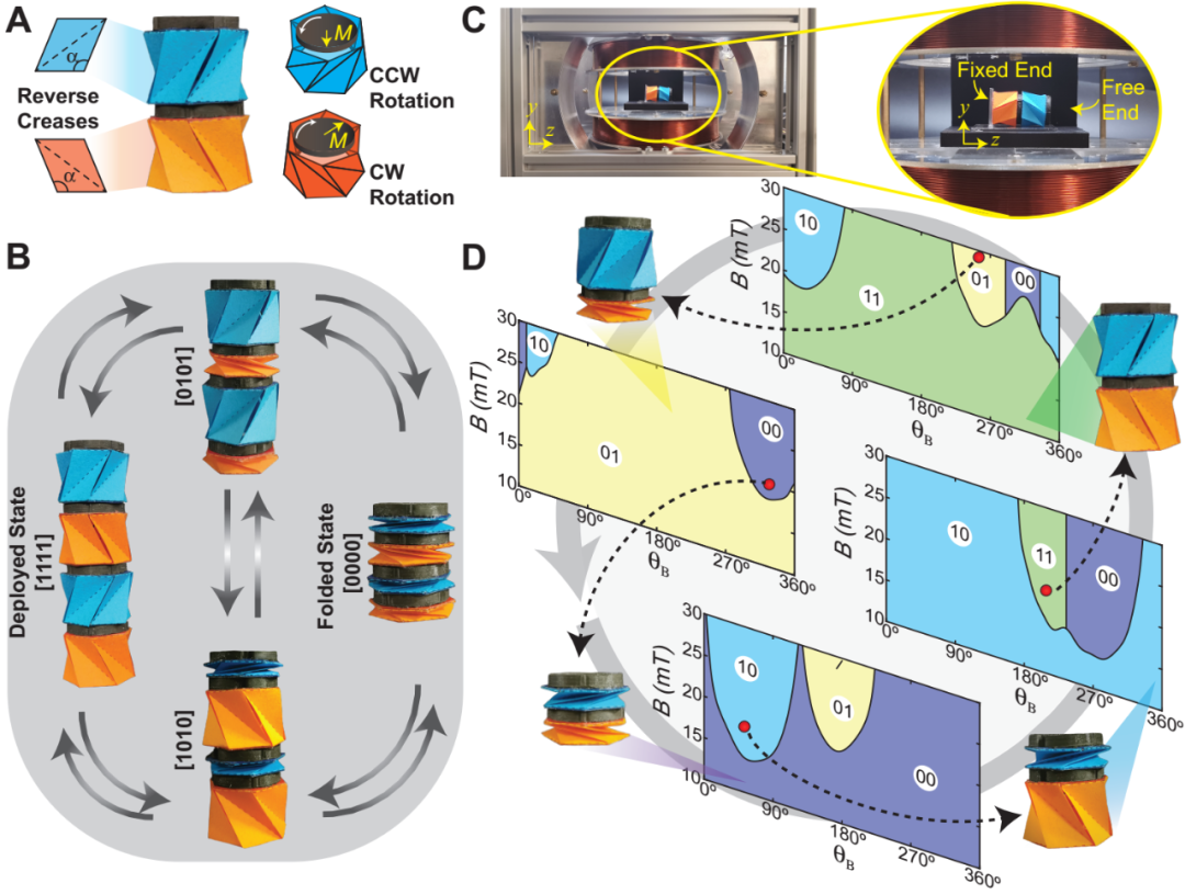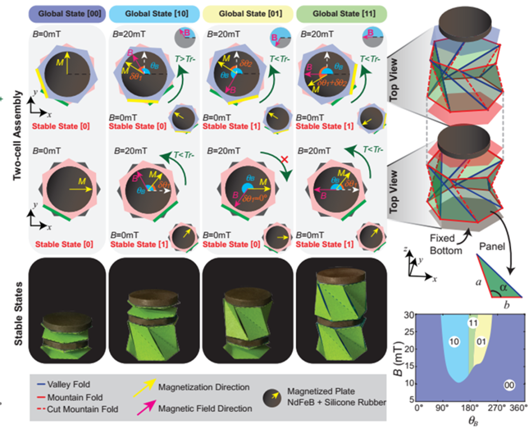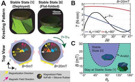 起源于民间的折纸(Origami)艺术不仅具有艺术审美价值,还蕴含数学运算和空间几何原理。近些年来,折纸在科学界引起了越来越多的关注,已经被广泛运用到了航天、生物医疗等领域,这些应用利用了折纸艺术变形特性来建立各式各样多功能、易展开、可变特性的系统。可靠的变形需要合适的驱动,目前常用的驱动方式包括机械、气动或者以形状记忆高分子为代表的智能材料,然而现有的方法往往具有驱动器体积庞大,驱动系统复杂,导线气动软管束缚,响应速度慢,或不易实现分布式控制等缺点。