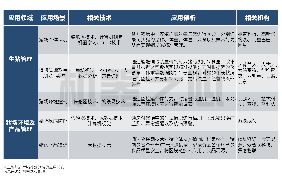 阿里云:阿里云提出AI养猪解决方案,该方案架构以大数据、云计算和人工智能技术为支撑,以自研的关键技术为核心,在养猪行业打造场景化实用性AI产品体系,满足不同养殖场景的多元需求。该解决方案基于生猪养殖全生命周期进行管理,可使养殖企业数据更加完整、精准、减少人工投入,提升管理效率的同时可实现生产上的降本增效,提升收益。网易:网易公司打造味央农场用于农业养殖,其中猪舍应用了现代化农业技术,智能化运作6个人管理2万头猪。网易味央自主创新的全球唯一猪用厕所,解决了猪舍拥挤、脏臭等问题,实现猪群进食、排泄、休息分开,有利于更好地保持猪舍清洁卫生,减少疾病发生。配合猪用厕所的环保处理系统占地小、处理高效,处理终水水质超过自来水标准,且部分回用于冲洗猪舍和猪马桶,真正实现“零污染”。京东:京东农牧自主研发并推出集成“AI神农大脑”+“IoT 神农物联网设备”+“SaaS 神农系统”三大模块的智能养殖解决方案,为养殖场提供全方位的服务和管理; 可以帮助养殖企业降低饲料、人力、资源等成本,提升生产效率,并有效控制疫病的蔓延,降低养殖风险,为企业的生产经营保驾护航。智能养猪解决方案利用人工智能图像识别技术对猪只进行面部识别和建立档案,实现养猪生产环节“无线、无监督、无干扰、无接触”的智能化管理模式,有效降低成本,提高生产效益。睿畜科技:睿畜科技通过传感器、物联网和计算机视觉技术,建立了一整套生猪个体数据采集系统。睿畜科技全天候自动收集生猪的核心体温、身份档案、行走步数、采食行为、体型体重等数据。睿畜科技建立的生猪大数据平台,填补了畜牧发展的空白。睿畜科技旗下产品主要有用于体温及行为监控的电子医生;用于生猪个体追溯的智能耳标以及对猪场进行统一监控管理的天蓬系统。人工智能在生猪养殖领域的局限性