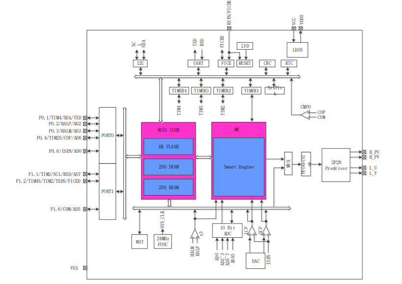 • 6kB Flash ROM、带CRC校验功能、支持程序自烧录和代码保护功能