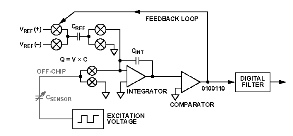 了解电容数字转换器(CDC) 的架构有助于理解 EMC 是如何影响 AD7150 工作的。电容数字转换器利用开关电容技术构建电荷平衡电路来测量电容,如下图所示: