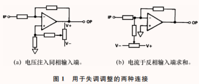 一般情况下,失调是通过连接于两个指定引脚之间的电位计进行调整的,其游标(有时通过电阻)连接至任一电源。正确的连接方法和元件值,请参阅相应器件的数据手册。运算放大器之间最常见的差异之一在于失调校正电位计的值及其应连接的电源。