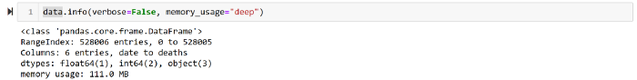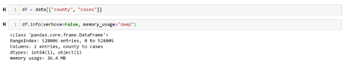 如果我们只需要数据集中的两列,即州名和病例数,那么为什么要加载整个数据集呢?加载所需的两列数据只需 36MB,可降低内存使用 32%。