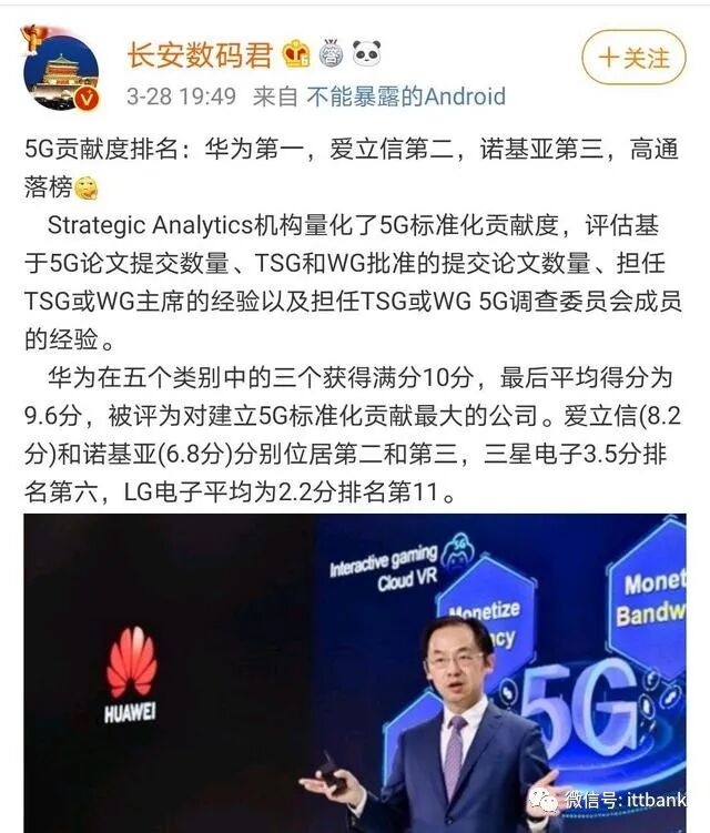 Strategic Analytics机构提供的5G标准化贡献度榜单中,华为也是排名第一。