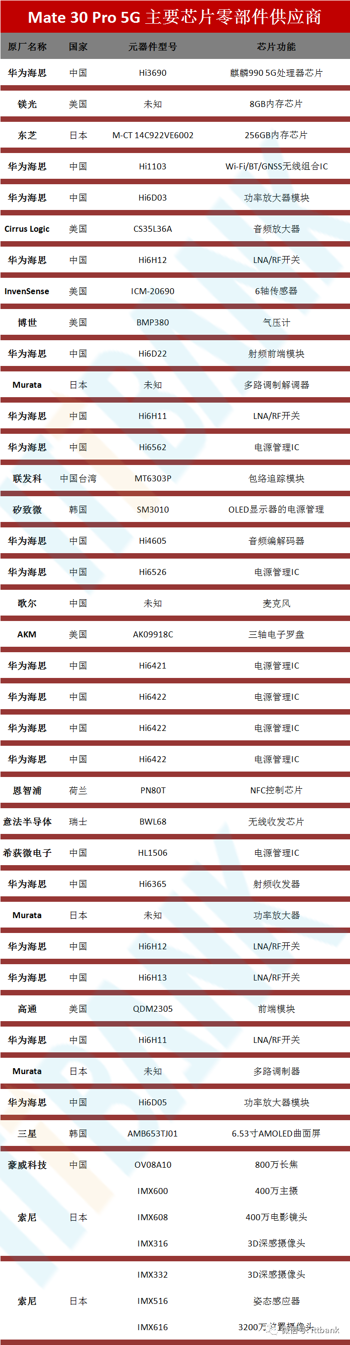顺便看看Mate 30 5G版本主要芯片零部件供应商: