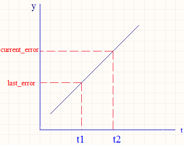 以速度控制为例,若y为error,如上图,在时间t1到t2的过程中,我们可以得到输出控制量error变化的趋势为(current_error - last_error)/Δt。得到偏差的变化趋势后,乘以Kp使输出量与error相对变化。这个道理犹如模拟电子电路中,声音信号经过功放管放大输出的信号与输入信号相对应的线性变化。
