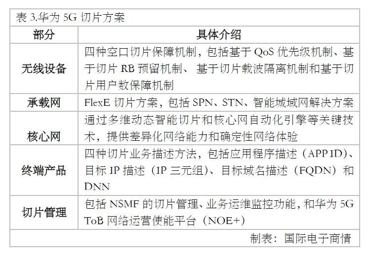 综上所述,网络切片是如此专业的细分技术,如何给电子行业带来商机呢?第一,硬件部分。以近期已经通过测试的华为5G切片方案(表3)来看,首先要基于独立部署(SA),所需硬件包含无线5G AAU、BBU;承载网所需的SPN设备和IPRAN设备;此外还需要核心网和切片管理器的各类网元。