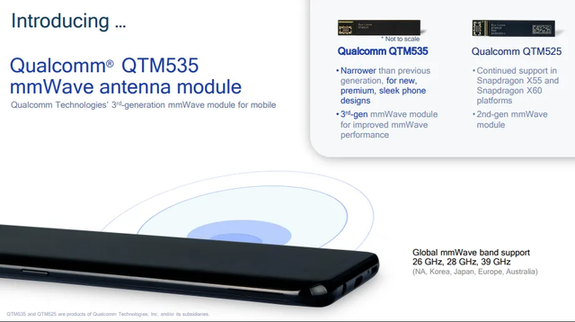 很多人会认为这是一个典型的苹果供应商多元化和成本削减措施,但是更可能是由于高通能提供的天线模块厚度达不到苹果的要求所致。高通的mmWave天线模块是第二代QTM525,这个模块被宣传为小于8毫米厚。配备了X55调制解调器和QTM525天线的最薄的出货设备是7.8毫米的S20+。而新款iPhone的厚度仅为7.4毫米。高通的下一代QTM535已经足够的薄,但它是2021年X60平台的一部分。苹果公司对最大厚度的追求使得开发一款定制的mmWave天线成为必要。
