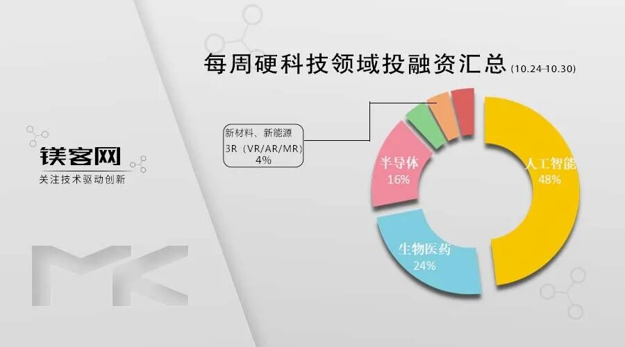 本周硬科技领域投融资事件一共25起,人工智能领域发生12起融资事件,其中1起为投资事件,占比48%;生物医药领域发生6起融资事件,其中1起为投资事件,占比24%;半导体领域各发生4起融资事件,占比16%;新能源、3R(VR/AR/MR)、新材料各领域发生1起融资事件,分别占比4%。