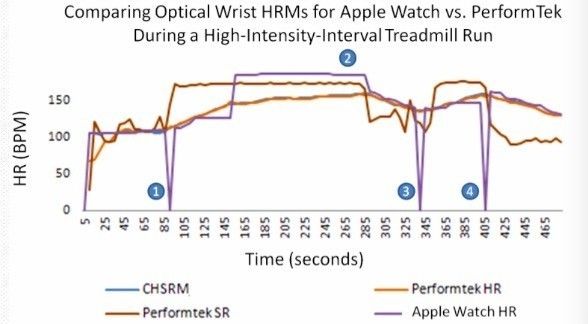 和其他腕部的光电式心率测量设备技术相比,很明显苹果表在“交叉”时显示的心率监测失败,标签1到4人的步伐速率和心率相似,苹果的数字信号不能将它们区分开来。第2处交叉有超过两分钟把心率读成了步伐速率。