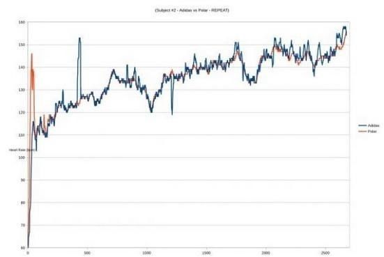 Polar心率带(橙色)与阿迪达斯miCoach运动手表(蓝色)心率数据对比