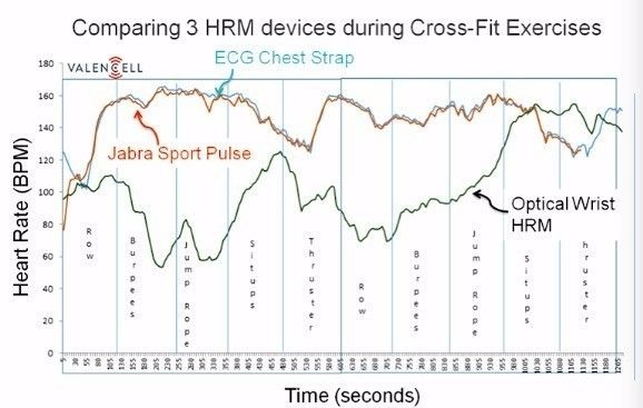 上图表明生物识别耳机和胸带都能很好的排列,而腕部的光电式心率测量设备则做不到。