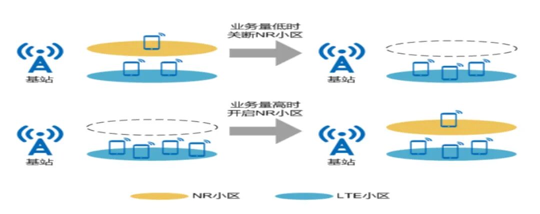 4G/5G共模基站协作关断:在4G和5G网络重叠覆盖区域下,引入5G与4G共模基站协作关断功能,根据业务量高低智能关断5G载波,实现节能效果。