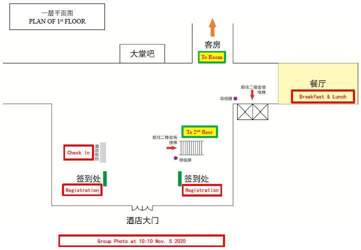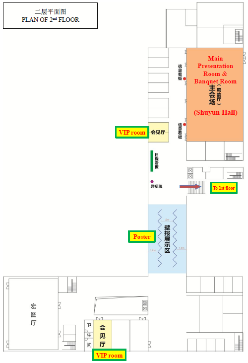 会议期间,5日及6日中午,可以选择在宏图厅(二楼)和阿波罗厅(一楼)进行就餐。酒店一楼二楼平面图如下所示。