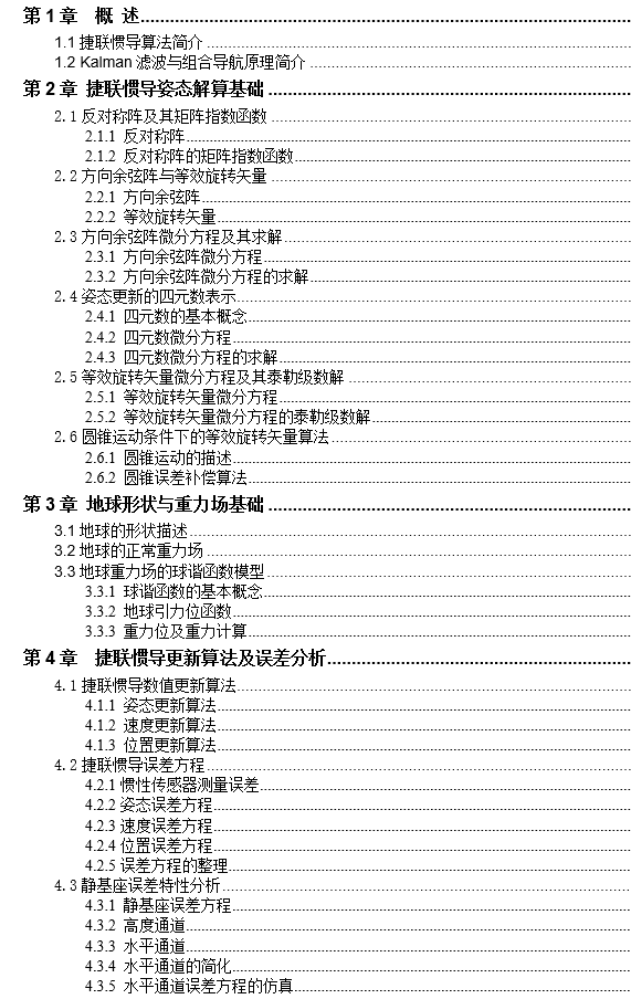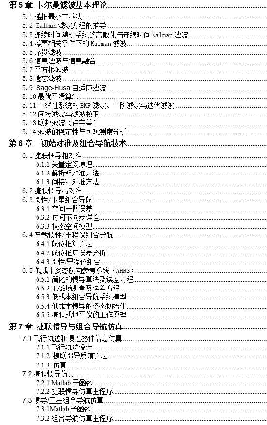 资料主要讨论捷联惯导系统算法方面的有关问题,包括姿态算法基本理论、捷联惯导更新算法与误差分析、组合导航卡尔曼滤波原理、捷联惯导系统的初始对准技术、组合导航系统建模以及算法仿真等内容。