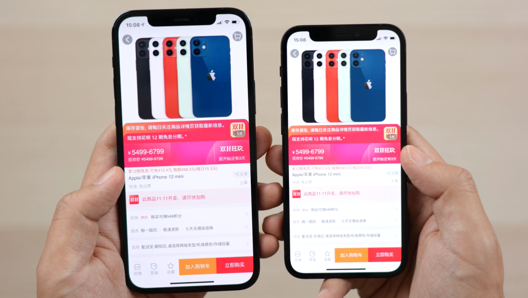 对于淘宝京东这类电商类应用,适配策略同样是等比例缩放,因此对于一些促销信息也可以完整地展示出来。通过实际测试,iPhone 12 mini 在显示电商 app 时,并没有太小的手指无法触控的按键出现,所以也可以正常使用。